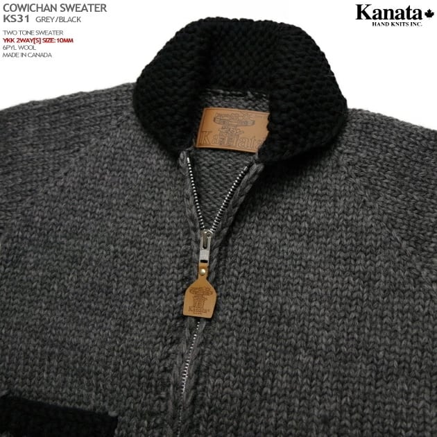 カウチンセーター|カナタ(KANATA)|カナダ製|KS31 TWO TONE SWEATER(ツートーン)無地|グレイ/ブラック|メンズ|ウール100%|6PLY WOOL(6本撚り)|フルオープン|YKK 2WAY[S] YKK製ジップアップ(10mm)|大きいサイズ|長袖
