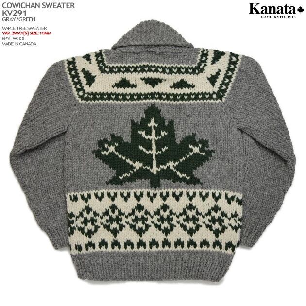 カウチンセーター|カナタ(KANATA)|カナダ製|KV291 MAPLE TREE(メープル ツリー)メープルリーフ 楓の葉|グレイ/グリーン|メンズ|ウール100%|6PLY WOOL(6本撚り)|フルオープン|YKK 2WAY[S] YKK製ジップアップ(10mm)|大きいサイズ|長袖