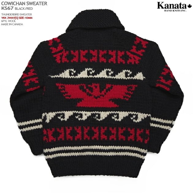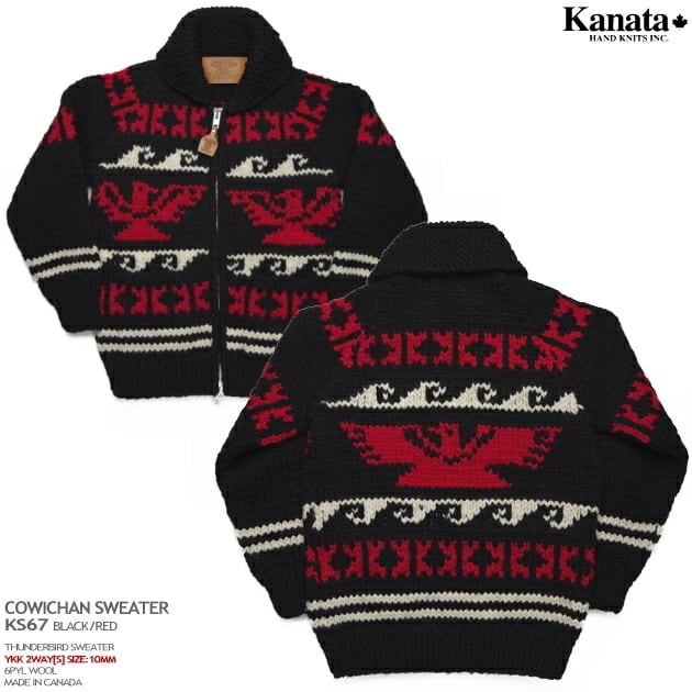 カウチンセーター(カウチンジャケット)|KANATA社(カナタ)|カナダ製|KS67 THUNDERBIRD WAVE(サンダーバード ウェーブ)|ブラック/レッド|メンズ|ウール100%|6PLY WOOL(6本撚り)|フルオープン|YKK 2WAY[S] YKK製ジップアップ(10mm)|大きいサイズ|長袖|2025-26年秋冬モデル新作 メンズ&レディース KANATA社 カナタ カナダ製 大人の遊び着 カウチン セーター ニット 防寒着