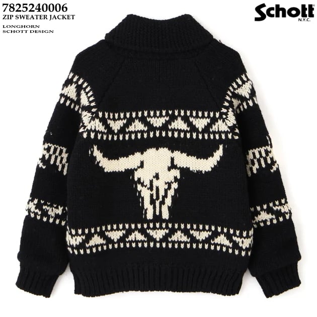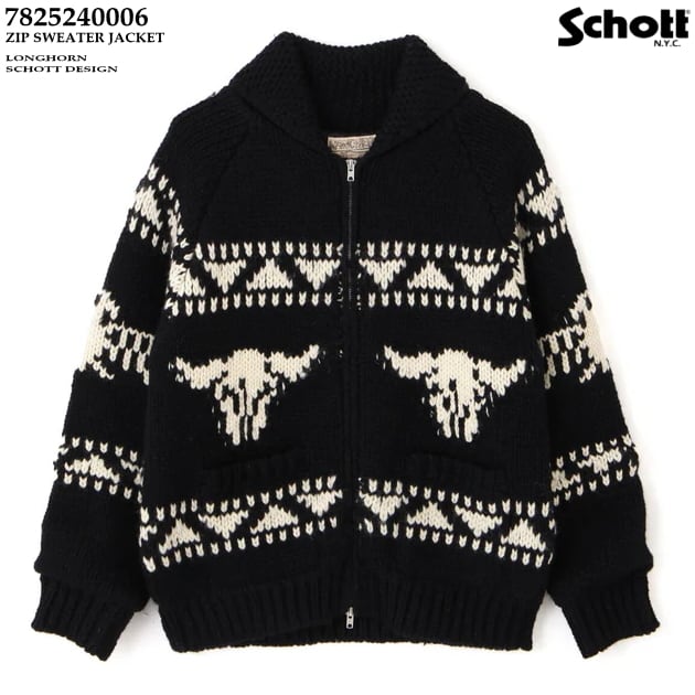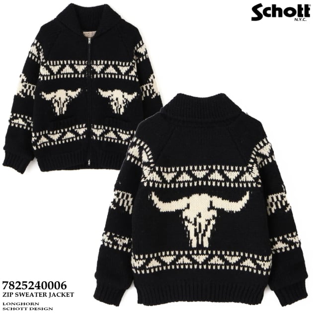 ジップ セーター ジャケット|カウチンセーター|ジップカーディガン|ショット(SCHOTT)SCH7825240006| ロングホーン(LONGHORN)牛骨|ブラック|メンズ|表地:ウール80%ナイロン20%|裏地付き|フルオープン|ジップアップ|長袖|2025-26年秋冬モデル メンズ&レディース Schott(ショット)ジップカーディガン 秋冬モデル新作 ショットデザイン 大人の遊び着 カウチン セーター ニット