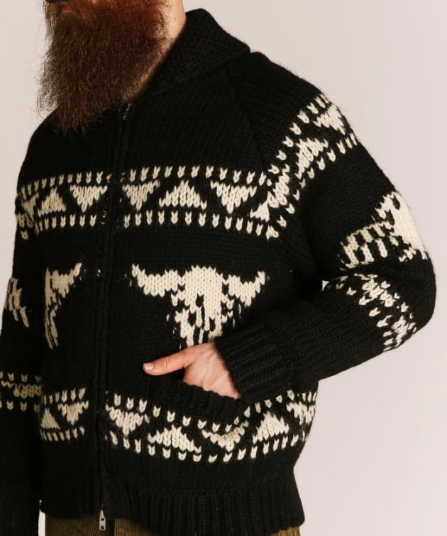 ◎カウチンセーターで馴染み深いロングホーン(牛骨)ショットデザインがジップセータージャケットで蘇る。