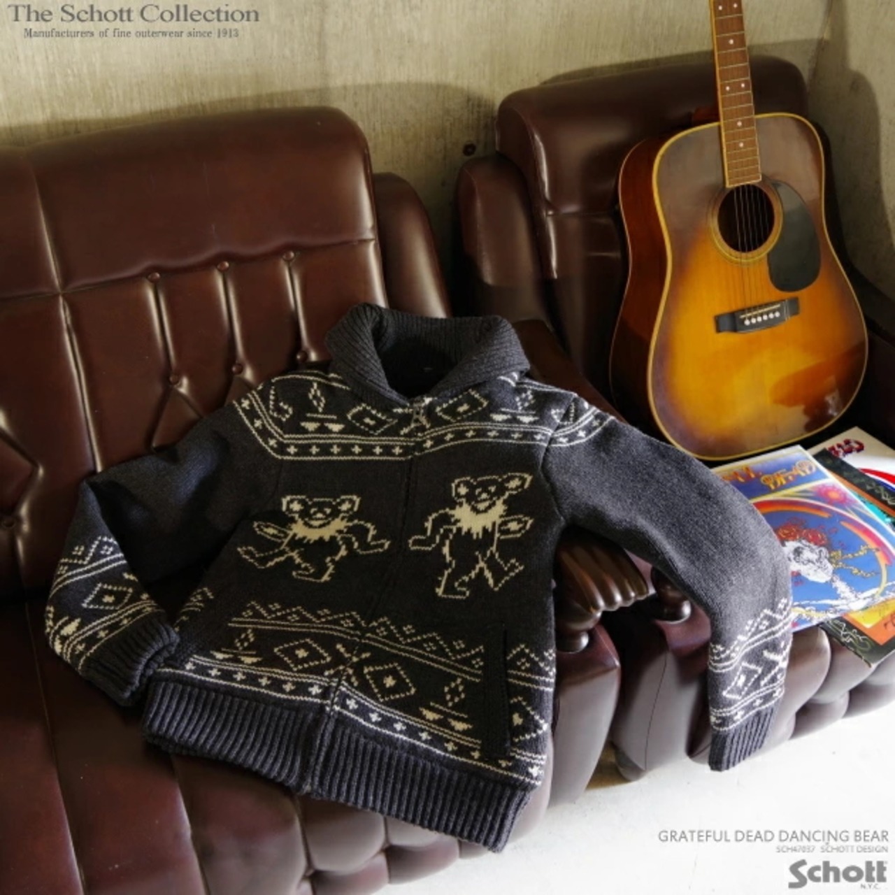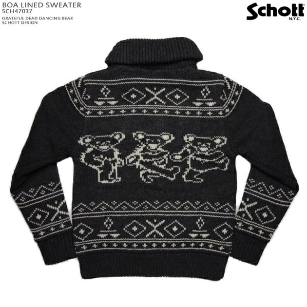 ボアラインドセーター|ジップカーディガン|カウチンセーター|ショット(SCHOTT)SCH-47037| グレイトフル デッド(ダンシング ベア)(GRATEFUL DEAD DANCING BEAR)|ブラック|メンズ|表地:ウール80%ナイロン20%|裏地ボア付き|フルオープン|ジップアップ|長袖|秋冬モデル メンズ&レディース Schott(ショット)ジップカーディガン ショットデザイン 大人の遊び着 カウチン セーター ニット